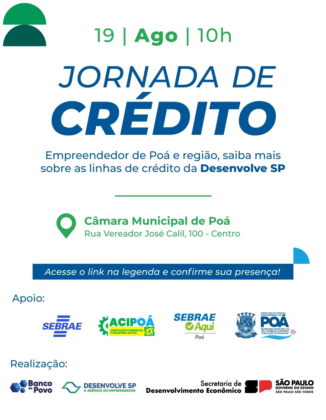 A Desenvolve SP, agência de fomento do Estado de São Paulo vinculada à Secretaria Estadual de Desenvolvimento Econômico, realiza no próximo dia 19 de agosto, às 10 horas, uma edição da Jornada de Crédito em Poá. O encontro será na Câmara Municipal, localizada na Rua Vereador José Calil, 100, no centro da cidade, e contará com a participação da Secretaria de Indústria, Comércio e Relações do Trabalho de Poá, Associação Comercial e Industrial de Poá (ACIPOÁ), Sebrae Aqui e do Banco do Povo unidade Poá.