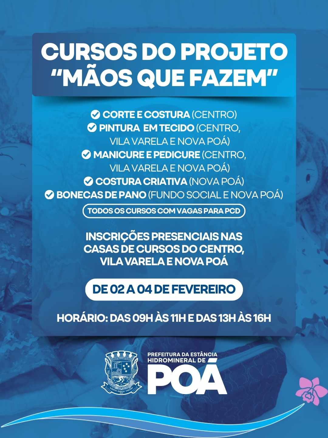 A Prefeitura de Poá, por meio do Fundo Social, abre nesta segunda-feira, 2 de fevereiro, as inscrições para os cursos gratuitos do projeto Mãos que Fazem, iniciativa que tem como objetivo ampliar as oportunidades de qualificação profissional, geração de renda e reinserção no mercado de trabalho para moradores da cidade. As capacitações oferecidas incluem Corte e Costura, Pintura em Tecido, Manicure e Pedicure, Costura Criativa e Bonecas de Pano, atendendo diferentes perfis e interesses da população.