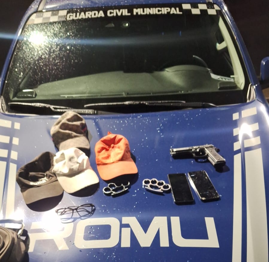 Os agentes localizaram com os adolescentes uma arma de fogo de brinquedo, dois socos inglês e um celular com registro de roubo ou furto, cujo número de registro estava bloqueado.