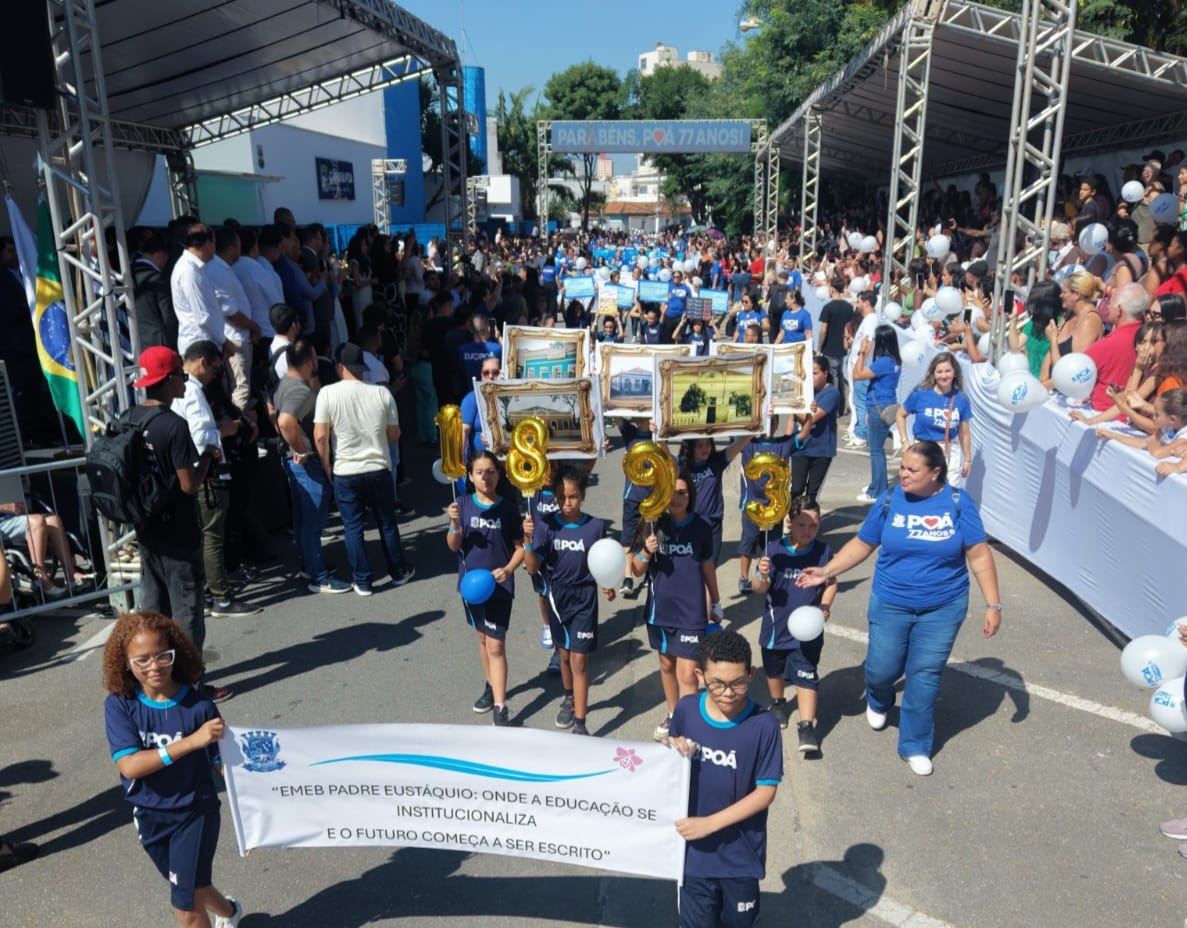 Realizado na rua Vereador José Calil, em frente à Câmara Municipal, o desfile integrou as comemorações oficiais do aniversário da cidade. Com o tema “A História, o Desenvolvimento e a Cultura de Poá”, o evento destacou a trajetória do município ao longo dos anos.