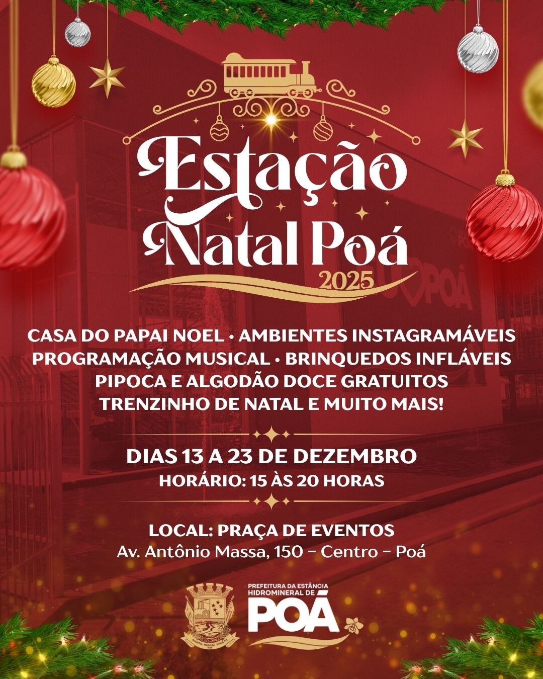 O prefeito Saulo Souza, ao lado da primeira-dama e presidente do Fundo Social, Flavia Souza, anunciou oficialmente a Estação Natal Poá 2025, que marcará a retomada de uma grande celebração natalina na cidade. Entre os dias os 13 e 23 de dezembro, das 15 às 20 horas, a Praça de Eventos Lucília Gomes Felippe receberá a Vila de Natal, com a Casa do Papai Noel, decoração temática, além de atrações gratuitas, como brinquedos infláveis e atrações culturais, enquanto a Praça da Bíblia já recebeu a maior árvore de Natal da história de Poá, reforçando o brilho especial desta edição. A programação inclui ainda um trenzinho de Natal que irá circular pelo centro da cidade.