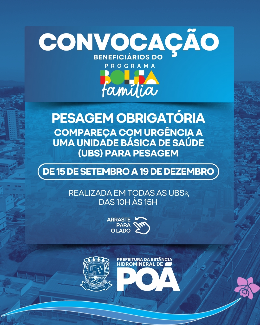 A Secretaria de Assistência Social de Poá anunciou a convocação dos beneficiários do programa Bolsa Família para a pesagem obrigatória, etapa essencial para manutenção do benefício. O procedimento acontece entre os dias 15 de setembro e 19 de dezembro, em todas as Unidades Básicas de Saúde (UBSs) do município, das 10 às 15 horas.