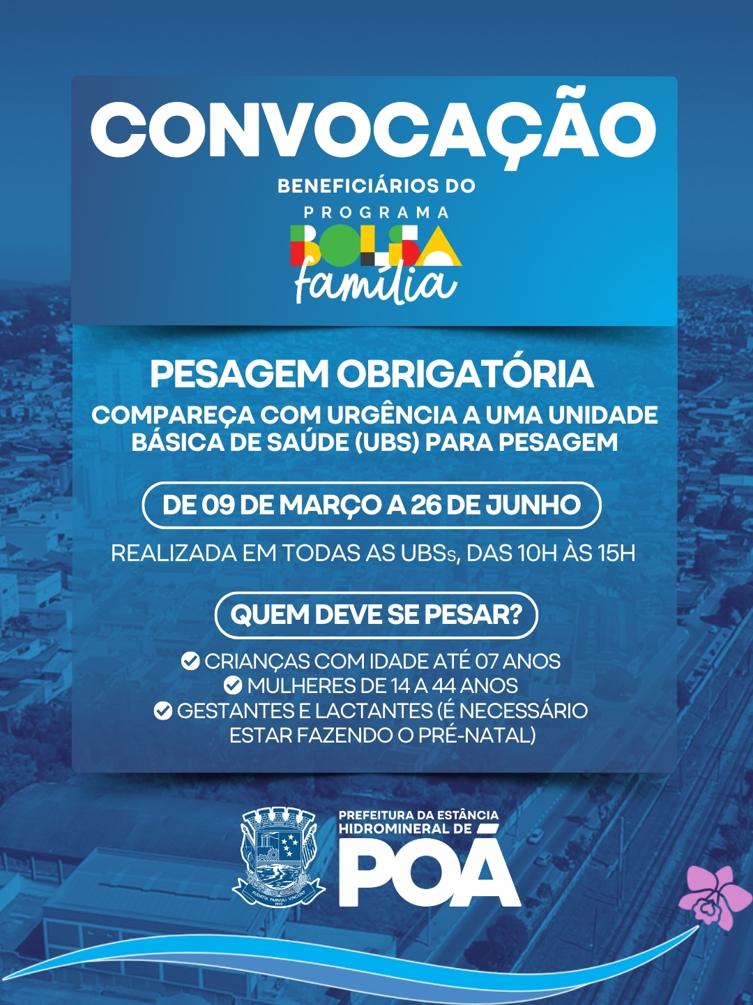 A Prefeitura de Poá, por meio da Secretaria de Assistência e Desenvolvimento Social, está convocando os beneficiários do programa Bolsa Família para a realização da pesagem obrigatória, etapa necessária para a manutenção do benefício. O procedimento deve ser realizado até o dia 26 de junho, em todas as Unidades Básicas de Saúde (UBSs) do município, das 10 às 15 horas.