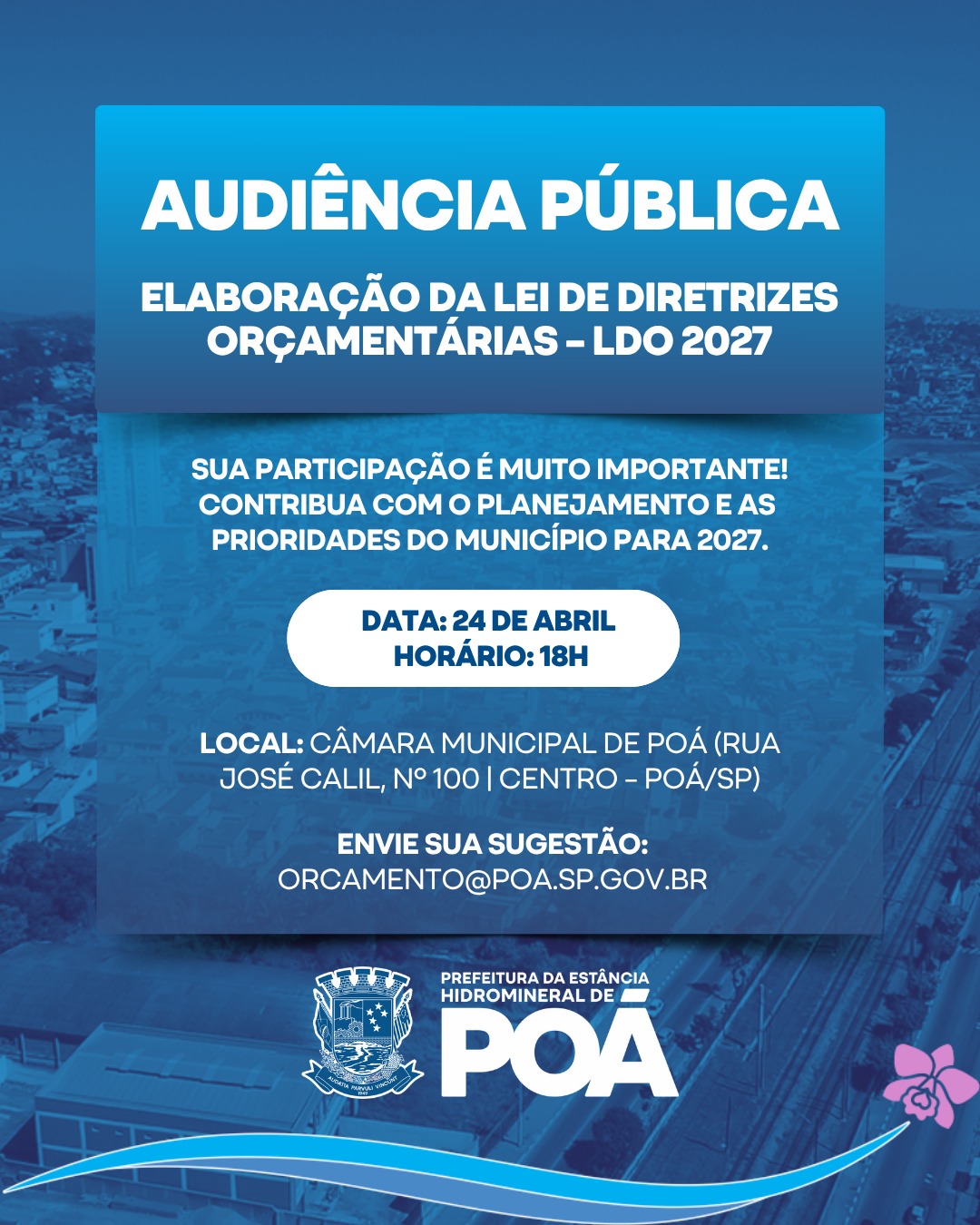 A Prefeitura de Poá, por meio da Secretaria da Fazenda, realizará no próximo dia 24 de abril, às 18h, uma audiência pública para a elaboração da Lei de Diretrizes Orçamentárias (LDO) de 2027. O encontro acontecerá na Câmara Municipal de Poá, localizada na Rua José Calil, nº 100, no Centro, e tem como objetivo apresentar, discutir e receber contribuições da população sobre as metas e prioridades que irão nortear o orçamento municipal do próximo ano.