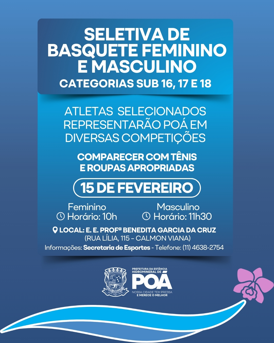 A Prefeitura de Poá, por meio da Secretaria de Esportes, fará neste sábado (15/02) uma seletiva para recrutar atletas de basquete masculino e feminino, nas categorias sub 16, 17 e 18. Os interessados devem comparecer com roupas e tênis adequados. A seleção feminina será às 10 horas e a masculina às 11h30. Os trabalhos serão realizados na Escola Estadual Professora Benedita Garcia da Cruz, localizada na rua Lília, 115, em Calmon Viana.