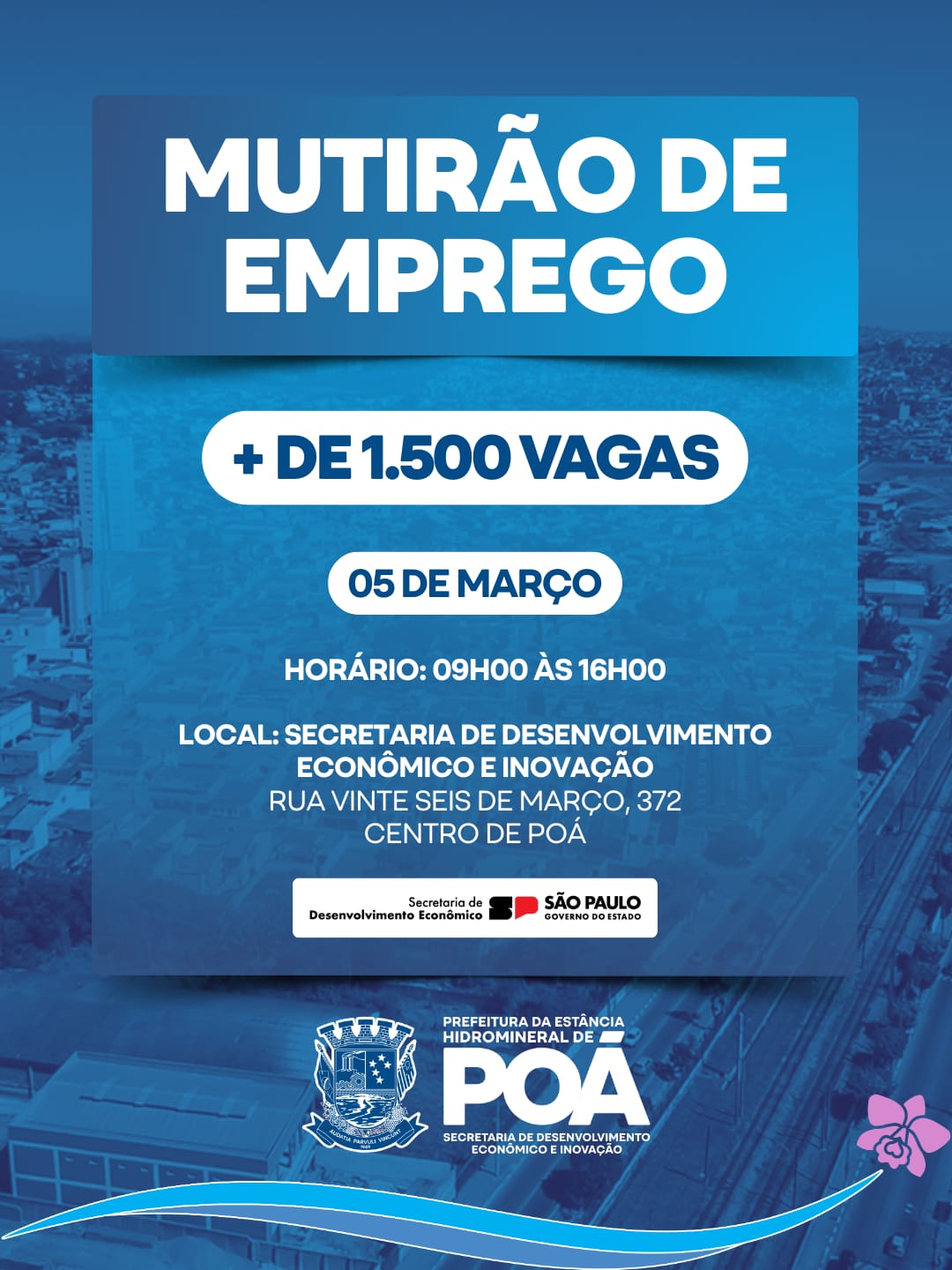 A Prefeitura de Poá promove, no próximo dia 5 de março, das 9 às 16 horas, um Mutirão de Emprego com 1,5 mil vagas imediatas, incluindo oportunidades destinadas exclusivamente a pessoas com deficiência (PCDs). O evento ocorrerá na Secretaria de Desenvolvimento Econômico e Inovação, localizada na Rua Vinte e Seis de Março, 372 – Centro de Poá, e reunirá empresas da cidade e da região em uma ação voltada à recolocação profissional e à inserção de novos trabalhadores no mercado.