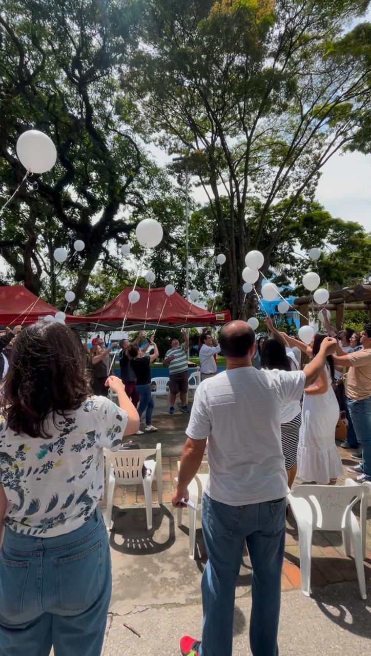 Ao final da ação, foram soltos balões brancos como um gesto simbólico de conscientização e de esperança, representando a importância do cuidado contínuo com a saúde mental e a busca por mais qualidade de vida emocional.