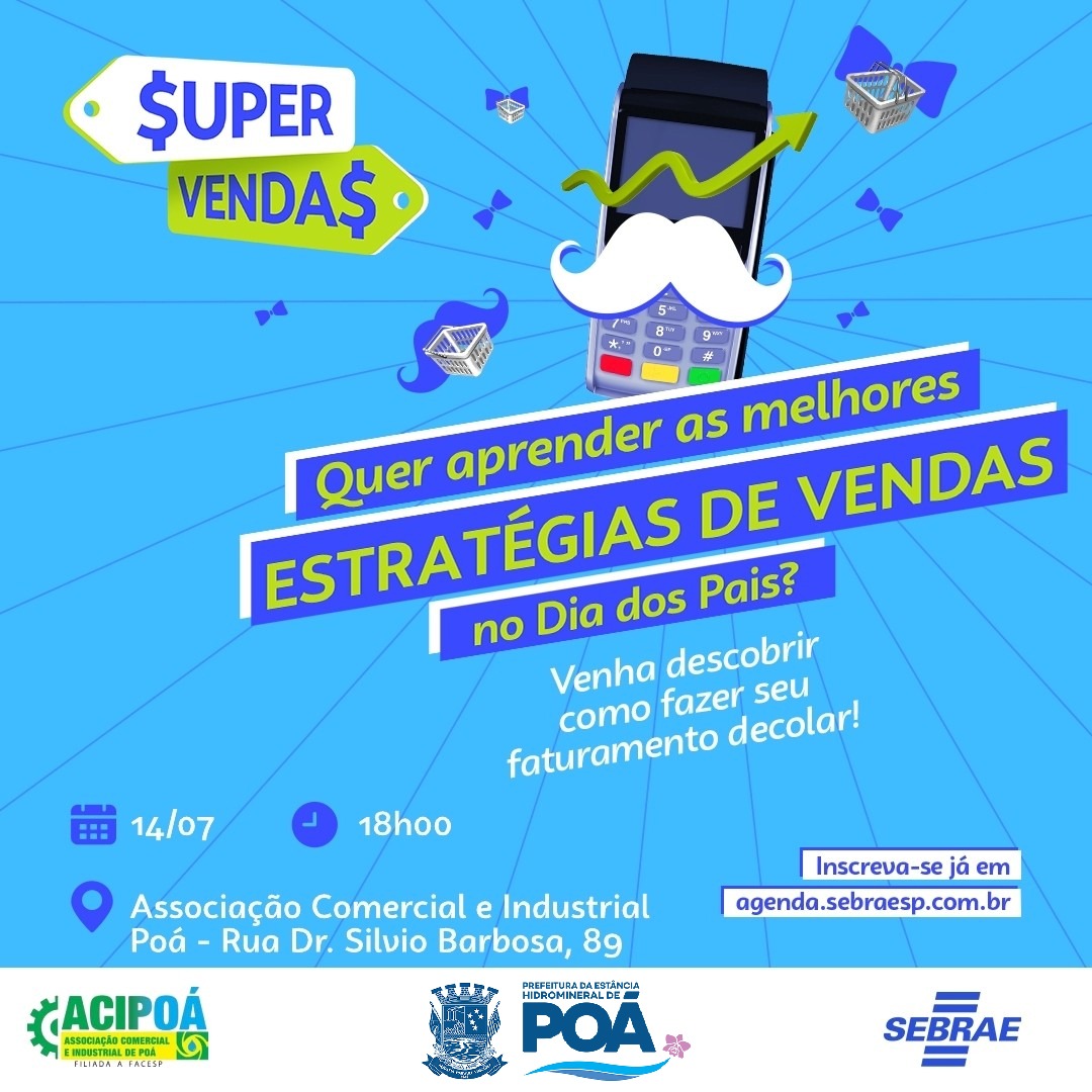A Prefeitura de Poá, a Associação Comercial e Industrial de Poá (ACIP) e o Sebrae SP promoverão no próximo dia 14 de julho, das 18h às 21h, uma palestra gratuita voltada aos empreendedores da cidade. O evento tem como foco capacitar comerciantes locais para alavancar suas vendas no Dia dos Pais, celebrado este ano em 10 de agosto.